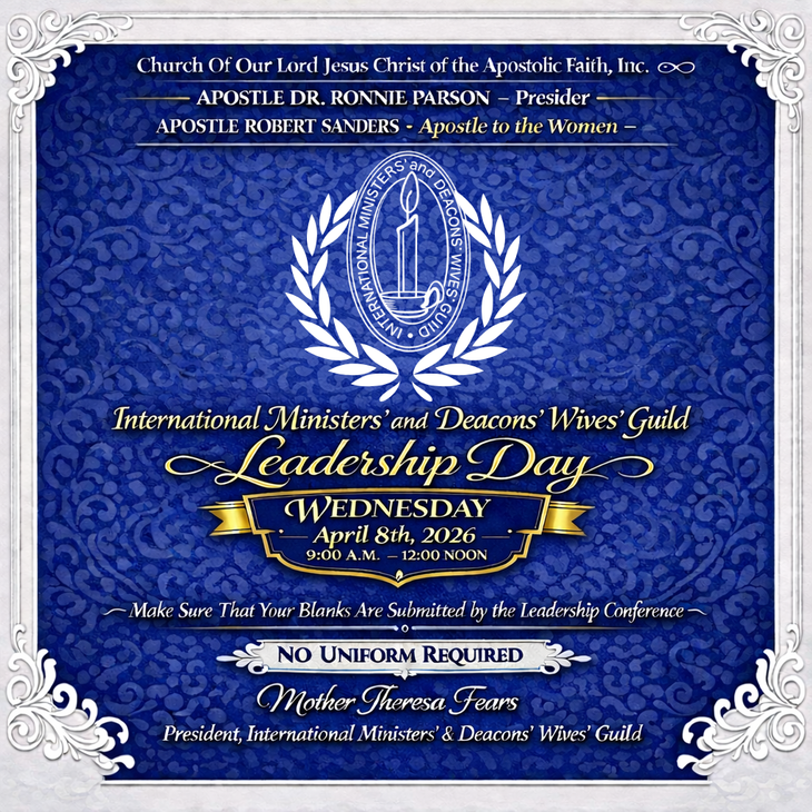 We believe that as wives of Ministers’ and Deacons’ of the Church Of Our Lord Jesus Christ of the Apostolic Faith, Inc, ( hereinafter referred to as “ The Guild”) it is our responsibility to see to it that the God-given vision neither dies from neglect, is distorted, nor grows dim in our remembrance or in the remembrance of our children.
