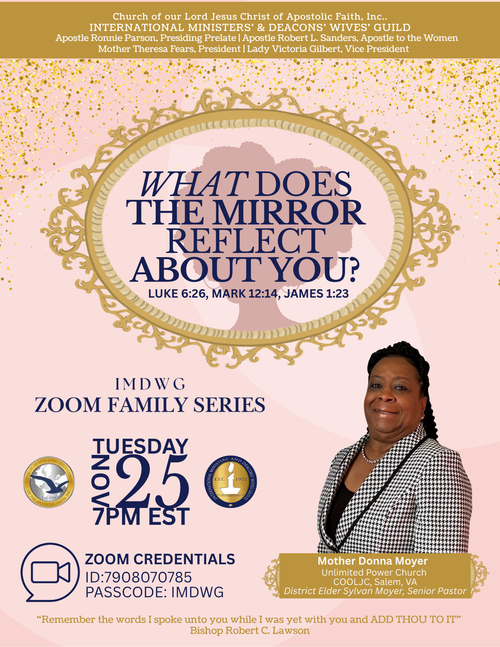 You are invited to join the International Ministers’ & Deacons’ Wives’ Guild for our next Zoom Family Series, “What Does the Mirror Reflect About You?” based on Luke 6:26, Mark 12:14, and James 1:23. Mother Donna Moyer of Unlimited Power Church (COOLJC, Salem, VA) will be our guest speaker as we examine what our lives reflect in the light of God’s Word. Make plans to gather your family and be with us next Tuesday, November 25 at 7:00 PM EST.